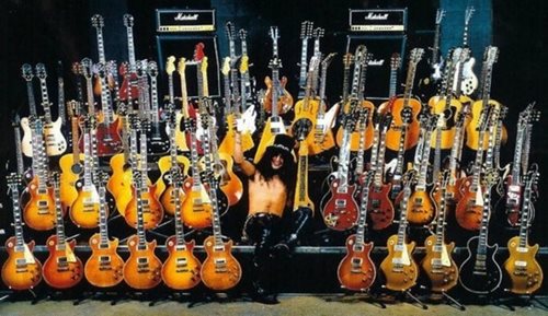 Do not let this become you. Slash poses with many of his beloved Les Pauls.