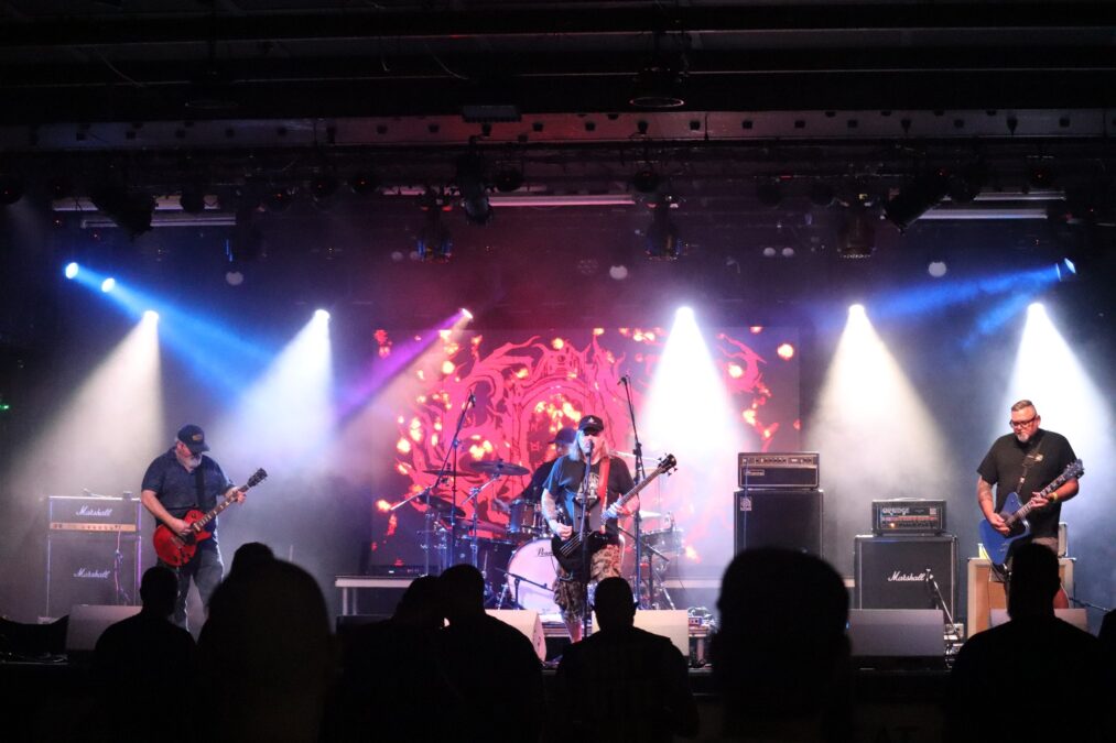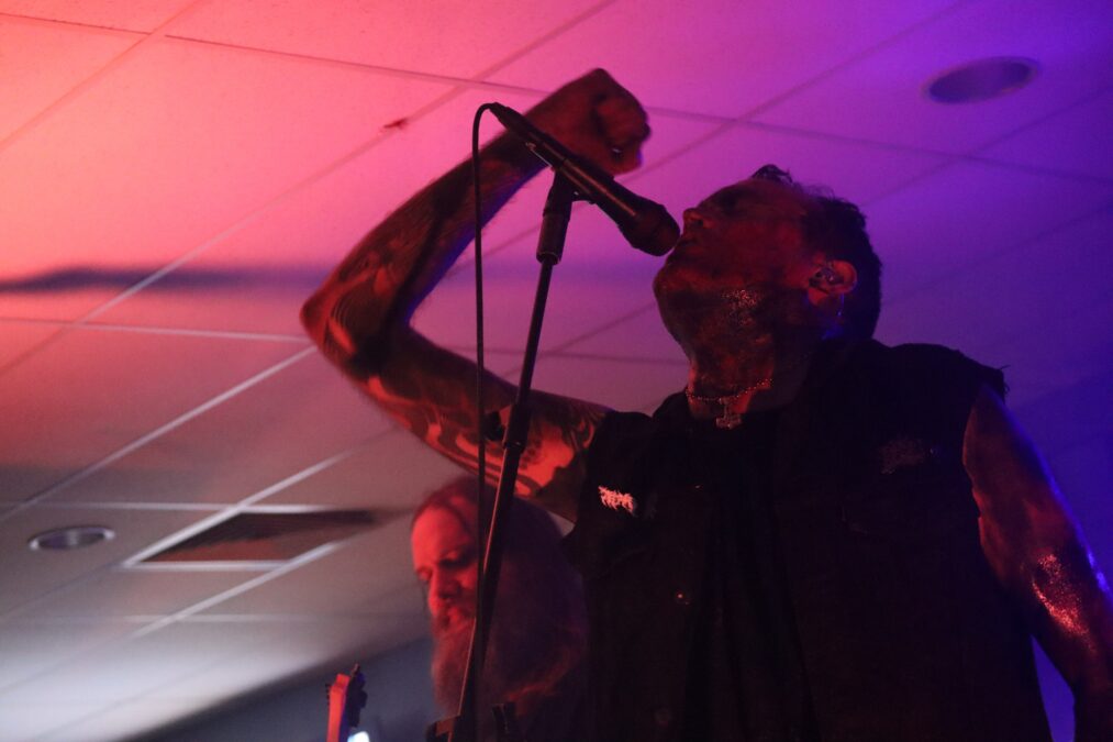 Resin Tomb. these guys take the award for the heaviest band for far in the Doom Saloon on the Black Flag Brewing stage. The crowds are now solid in both rooms with little room to spare. If we can get the smokers all inside, it’s gonna get real squishy, real quickly. This band may even be a bit heavy for me with blast beat after blast beat. Just as I type that though, they slow it down a bit for another one of those vulnerable, not so heavy bits. Then the double kicks blast back in at full pace, and its game on again.