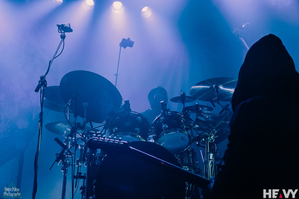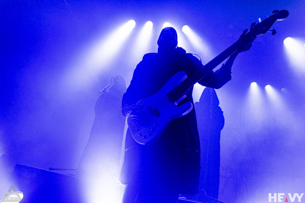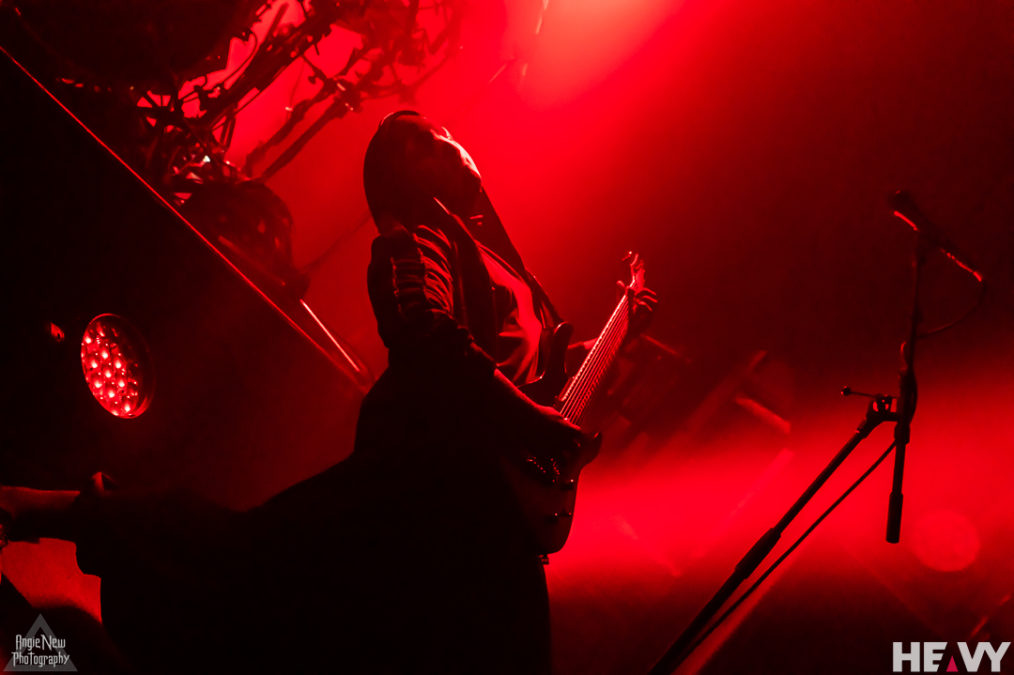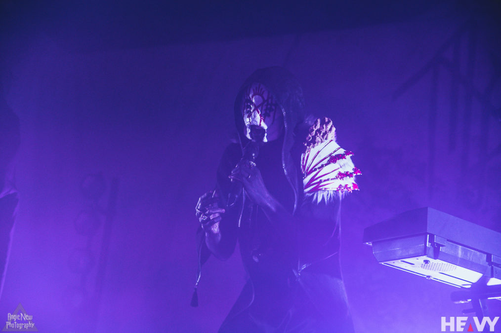 Once the clock ticked over to 9 pm, the shadowy figure of frontman Vessel, shrouded in smoke, crooned gracefully to the disjointed synth sounds of Chokehold as the remainder of the band staggered their entries before exploding into the resounding atmospheric sounds that define Sleep Token. The band flowed seamlessly into another new track called The Summoning, which shows the rich progressive nature this band can manifest, all the while teasing the worshippers with their upcoming album Take Me Back To Eden, due for release May 19. This track swayed between brutally powerful detuned guitars and drums into ethereal landscapes of haunting synths, falsetto vocals and beautifully layered backing vocals from the Sleep Token backing vocal ensemble.