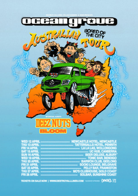 Kicking off their BORED OF THE CITY East Coast tour in Newcastle on Wednesday 12 April, the OG trio will then head to Penrith, Wollongong, Canberra, Albury, Bendigo, Geelong, Belgrave, Frankston and the Gold Coast, before closing out Friday 28 April on the Sunshine Coast. Also joining the fun will be Melbourne punk lords Deez Nuts and Sydney emo rockers Bloom.