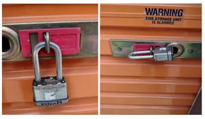 In these two photos you will see we have supplied this storer with a “keeper plate” The red plate behind the lock prevents the door latch from operating until the padlock is actually opened with a key.