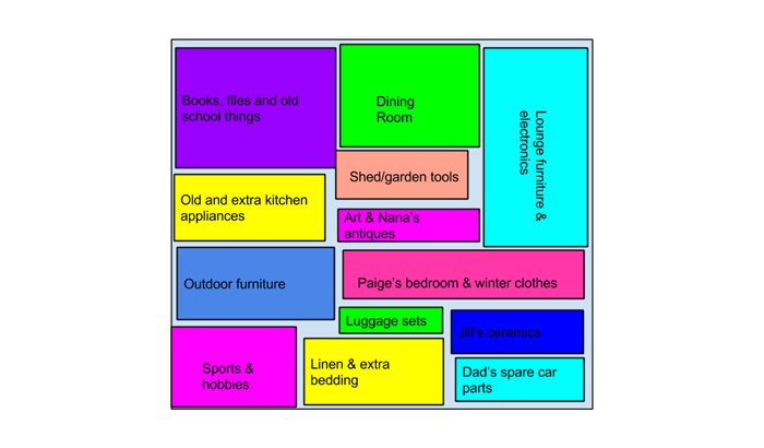 Before moving things into your storage unit, take a moment to decide where things should be packed, and draw up a map. For example, kitchen items in the back left corner, lounge items back middle, dining room back right, and so on.